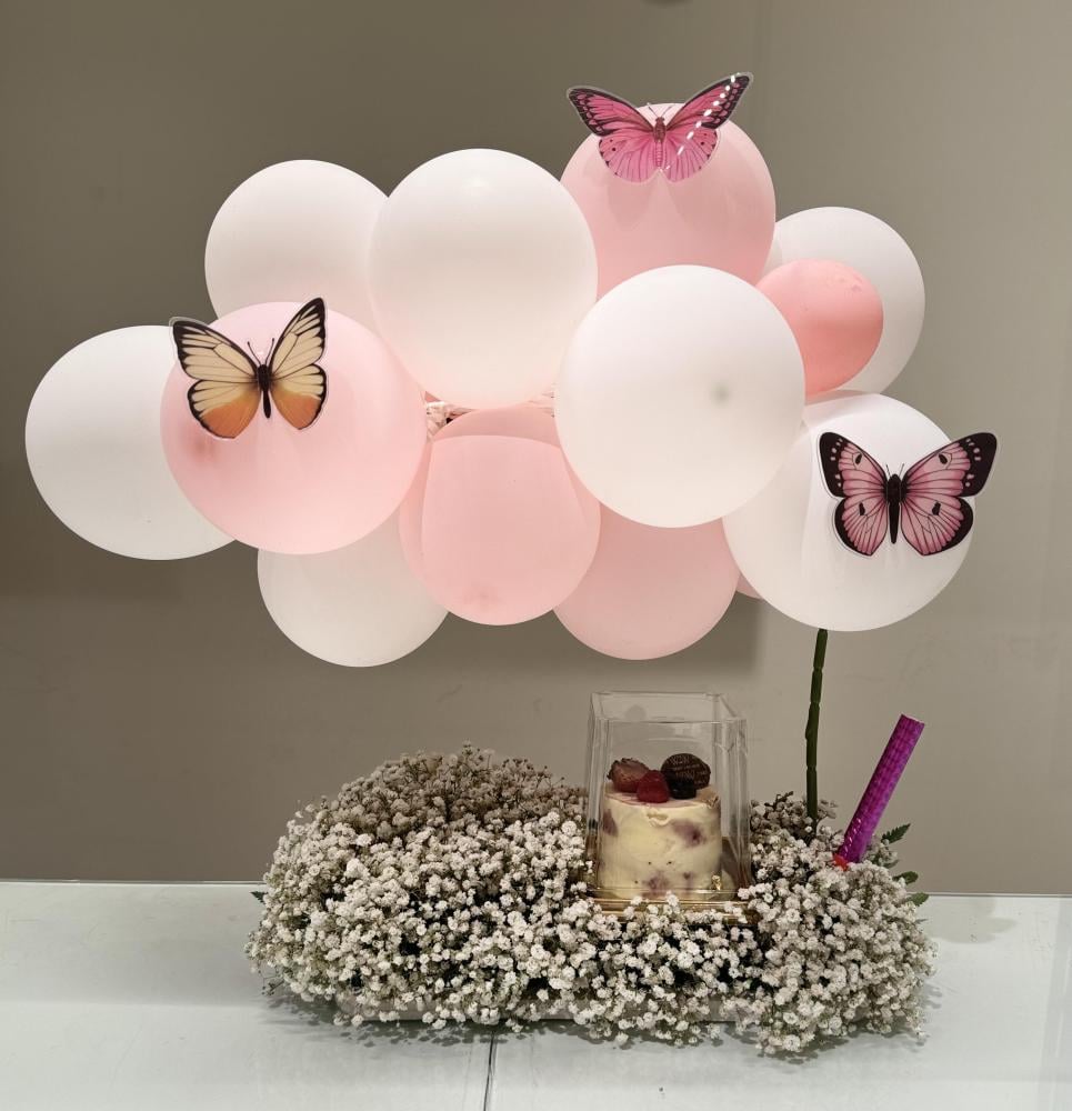 كيك ميني مع بالون وورد طبيعي وشراره